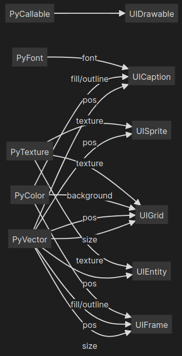 UI<thingy>.hshould include all the python interface method definitions, C++ class definitions, and PyTypeObject.UI.hwill import all of these. This is in turn imported by the rest of the McRogueFace projectThe static Type Objects that the module needs to import can be defined in the separate UI files, but inside the